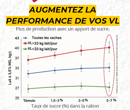 Pour être pleinement efficaces, l’apport optimum de sucres se situe autour de 6 % de la matière sèche de la ration, soit environ 1,3 kg de sucres par vache et par jour.