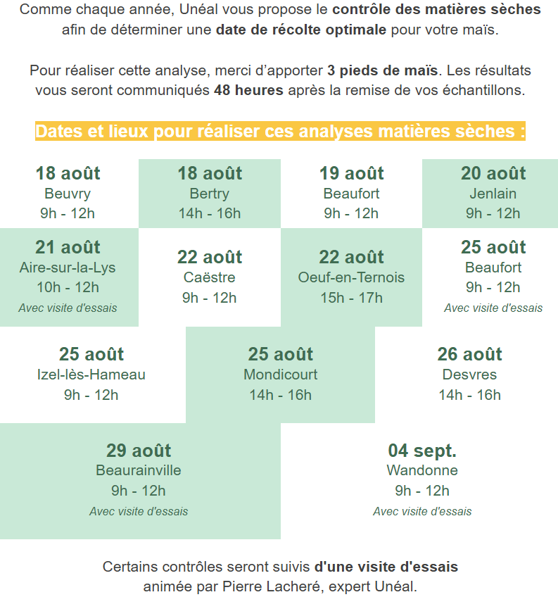 Comme chaque année, Unéal vous propose le contrôle des matières sèches de votre maïs, afin de déterminer la date de récolte optimale.