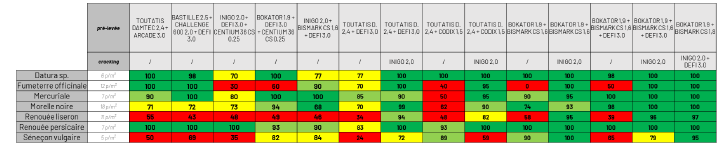 En l’absence de passage au stade cracking, les essais INOXATECH 2025 montrent qu’un mélange intégrant 4 matières actives devient nécessaire pour maintenir un niveau d’efficacité satisfaisant.