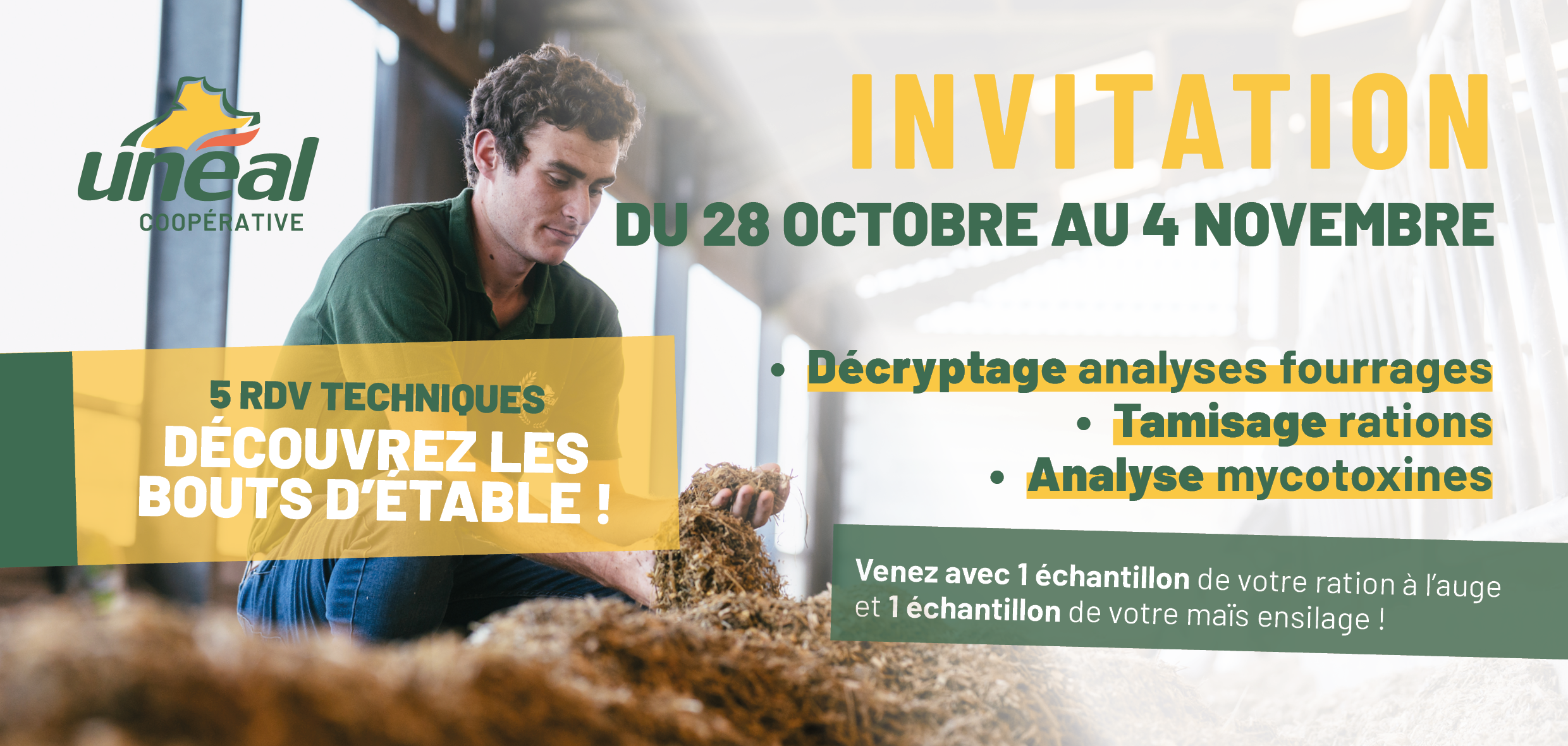 Les équipes des productions animales Unéal organisent 5 bouts d’étable « les bouts d’étable : piloter l’alimentation, de l’analyse à la ration ! » les 28, 29, 30, 31 octobre et 4 novembre.
